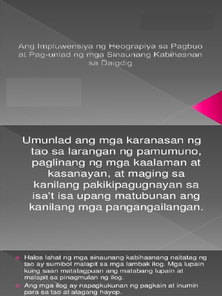 Evaluate the geographical condition lifestyle and the stages of development of. HEOGRAPIYA SA PAGBUO AT PAUNLAD NG MGA SINAUNANG KABIHASNAN SA DAIGDIG Malaki ang kaugnayan ng heograpiya sa pagbuo ng mga sinaunang kabihasnan na siyang humubog sa daloy ng kasaysayan sa daigdig. Isa ang HEOGRAPIYA sa mga salik na nakaaapekto sa daloy ng kasaysayan.